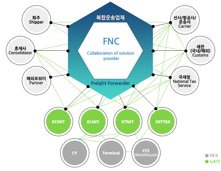 FNC 는 단순한 게이트웨이가 아니라 포워더 업체의 외부연계에 능동적으로 대처할 수 있는 서비스를 제공함으로써 포워더와 시스템 공급사를 리딩하고 포워더 중심의 국제 물류 네트웍을 구축하는 서비스입니다.